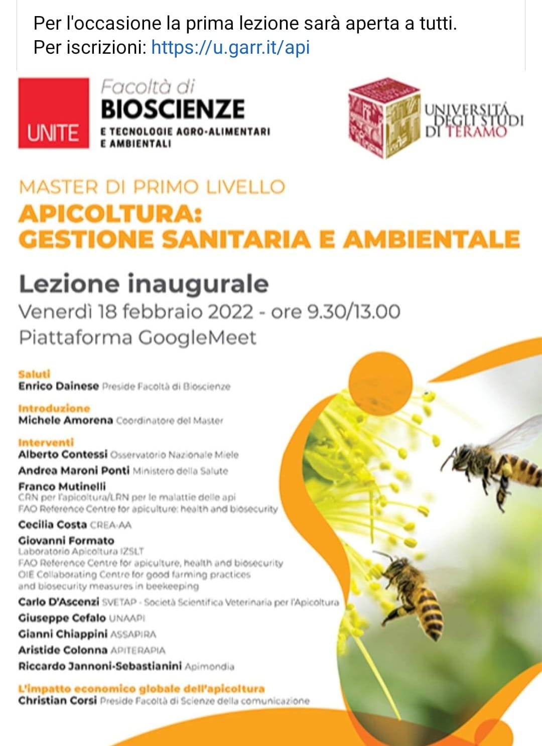 Venerdì 18 febbraio, dalle ore 9.30, si terrà la lezione inaugurale del Master di I Livello "Apicoltura: Gestione Sanitaria e Ambientale", dell'Università di Teramo.